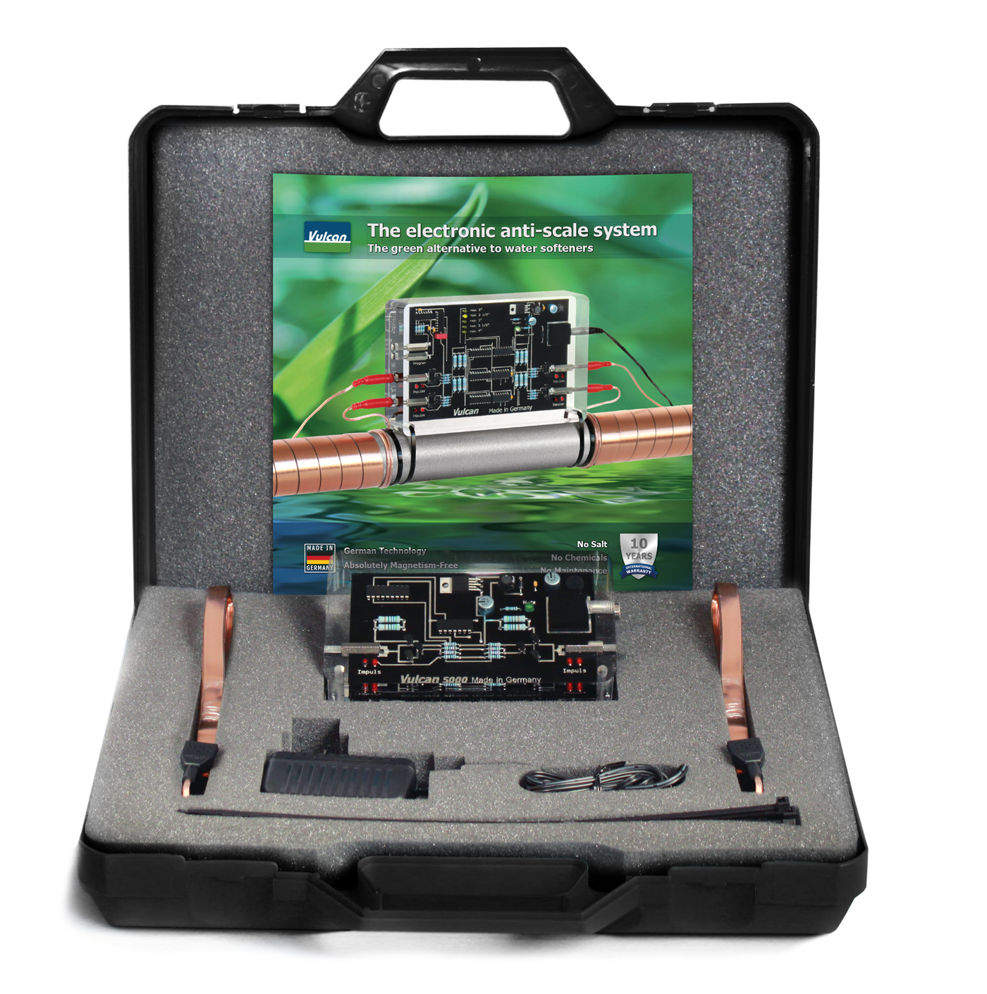 Vulcan is an eco-friendly water treatment system that prevents limescale depositis and rust in your piping system and appliances. The Vulcan-Impulse-Technology is based on the principle of physical water treatment. Special electronic impulses change the crystallization process of the liquid calcium. This way the hard limescale loses its adhesive power. The technology works exclusively with capacitive electric impulses: