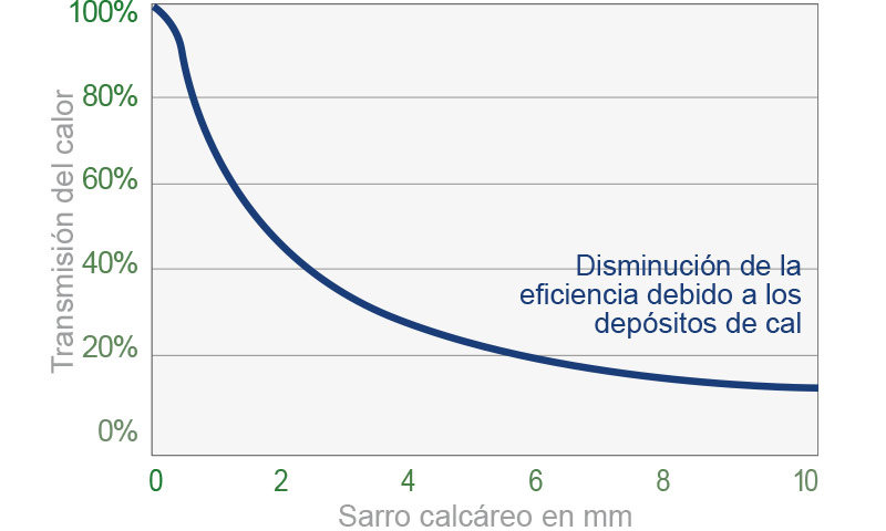 Un depósito calcáreo de sólo 2 mm puede causar una pérdida energética de más de 15%. El aumento del tiempo de calefacción tiene como consecuencia un incremento significativo del consumo de electricidad.